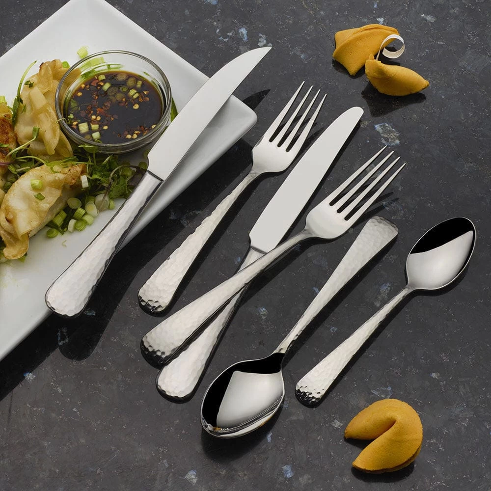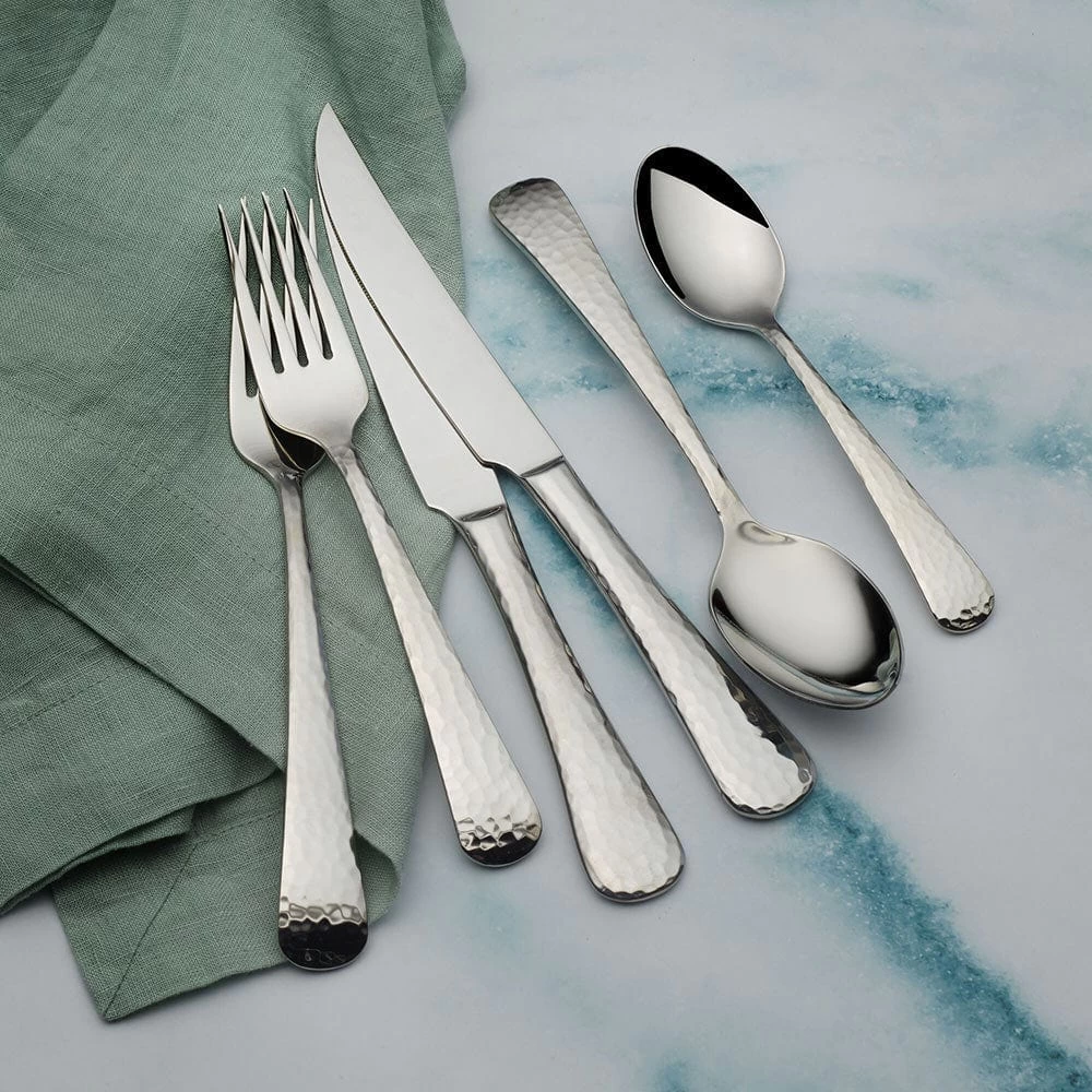 This Hammered Mirror Opulent Flatware Set features polished heads with a lustrous finish enhanced by the distinct hammered pattern on the handles, with a mirror finish. The design will inspire and enhance your table setting.